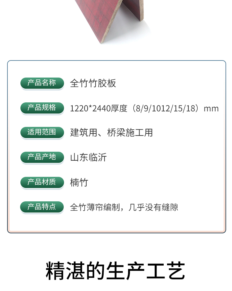 竹胶板是以毛竹材料作主要架构和填充材料,经高压成坯的建材。竹胶板,是高强覆膜桥梁板,建筑模板,及砖机托板等,竹胶板应用广泛,深受用户青睐。